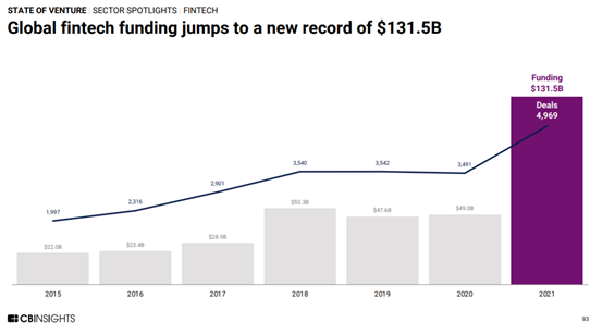 FinTech investments surpassed every year prior in 2021 – $131.5 billion.